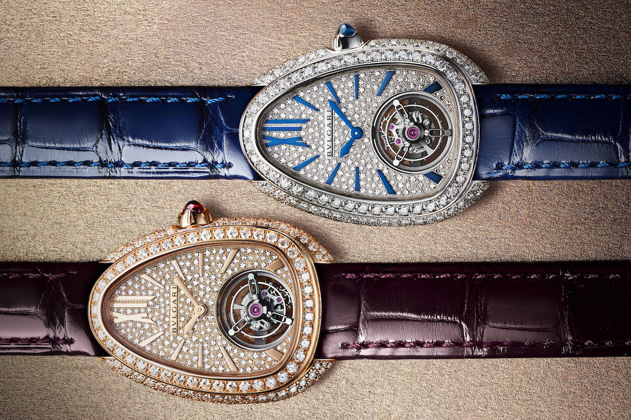 The watchmaking department at Bulgari has been on a mission to break records over the last few years, focusing on developing the thinnest movements possible. This year, the brand continues on its groundbreaking path with the introduction of the smallest tourbillon movement in the market, the hand-wound Caliber BVL150, housed in the new Bulgari Serpenti Seduttori Tourbillon. The Serpenti Seduttori collectsion is one of Bulgari’s newest women’s watch models, which takes a sleeker, modern approach to the famous Serpenti watch. Measuring 34mm wide, the snake-head shaped case is available in white gold or rose gold—both paved with diamonds but with the option of a bracelet or leather strap—and displays the tiny tourbillon at 6 o’clock on the dial.