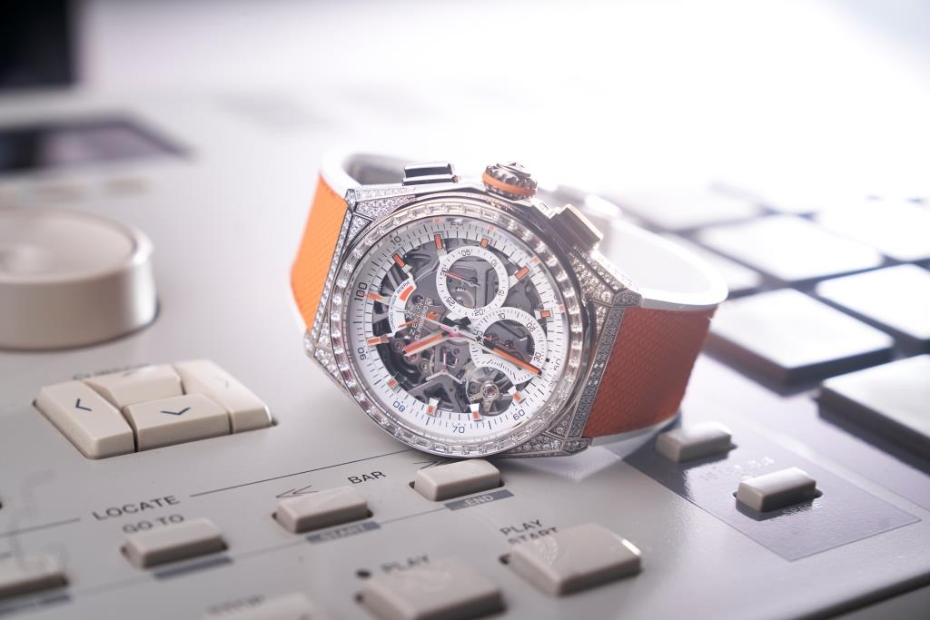 While the prominent attendees (including Alicia Keys and Fabulous) celebrated the two timepieces, an all-new Defy watch ticked the pinnacle of the evening when it was delivered by a DJI Phantom 4 Pro drone above the crowd. The novel watch – Defy El Primero 21 Swizz Beatz Edition Unique – features a vibrant orange strap, a gleaming white dial, a 44mm white-gold case, set with 288 round diamonds, and a bezel with 44 baguette-cut diamonds.